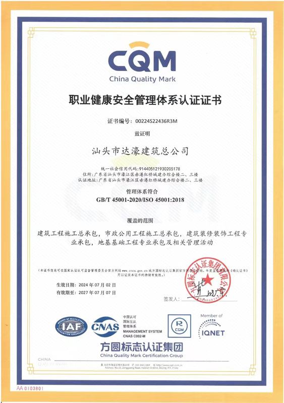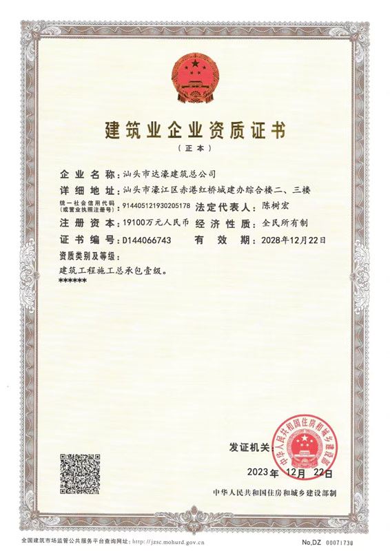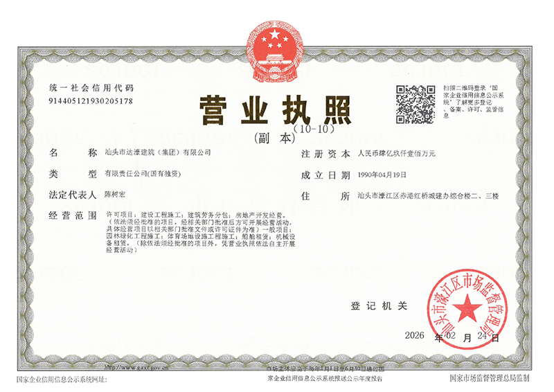 汕頭市達濠建筑(集團)有限公司(以下簡稱“公司”)成立于1990年。2026年2月24日經汕頭市濠江區(qū)市場監(jiān)督管理局核準,由原汕頭市達濠建筑總公司變更登記為汕頭市達濠建筑(集團)有限公司。公司現(xiàn)注冊資金肆億玖仟壹佰萬元,是具有建筑工程施工總承包壹級、建筑裝修裝飾工程專業(yè)承包壹級、地基基礎工程專業(yè)承包壹級、市政公用工程施工總承包貳級、港口與航道工程施工總承包貳級、機電工程施工總承包貳級、水利水電工程施工總承包貳級、鋼結構工程專業(yè)承包貳級、建筑機電安裝工程專業(yè)承包貳級、房地產開發(fā)貳級資質的國有獨資企業(yè)。
